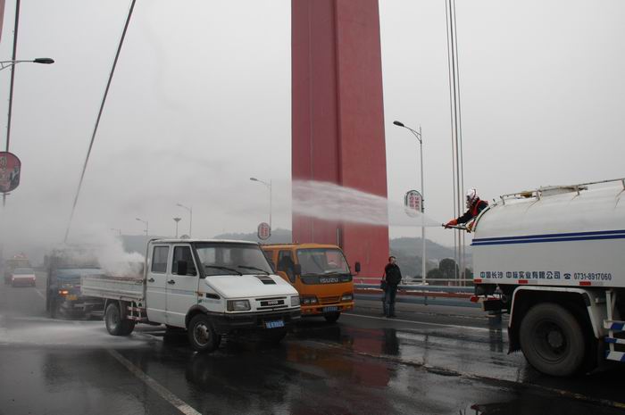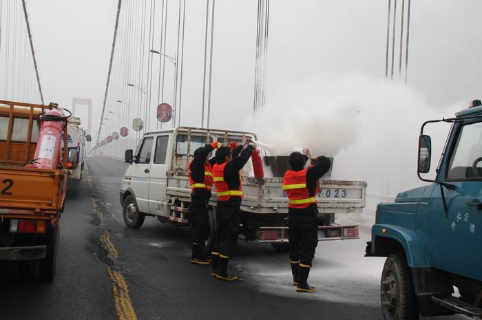 随后,各部门按照预案要求,迅速而有条不紊地开展相关工作:路政人员在主桥上实施交通管制;高速巡警封闭主线高速公路;收费部门暂停上桥入口通道放行;治保队员封闭大桥人行通道;养护部门出动人员和洒水车实施灭火并清理现场。5分钟后,事故救援工作结束,高速巡警和路政人员对现场进行勘验,确认“事故现场”危情已被消除,并向监控中心报告救援相关情况。当监控中心把“事故处理完毕,主桥交通可以恢复通行”的情况向预案演练总指挥潘宜刚进行报告后,并宣布演练圆满结束。