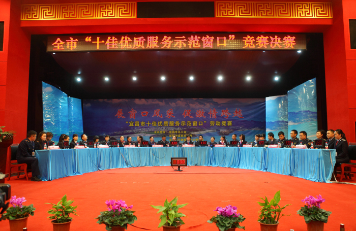 宜昌市“十佳优质服务示范窗口”创建活动是宜昌市总工会、市直机关工委、宜昌市行政服务中心联合组织的一次旨在提高全市行政审批服务质量的岗位练兵活动。此次比赛活动共有全市262个窗口单位参赛。经过前期群众评议、社会调查和业绩考核,13个县市区和32个市直行政审批部门窗口进入预赛。通过第一轮笔试预赛,决出10个县市区窗口和10个市直窗口进入总决赛。