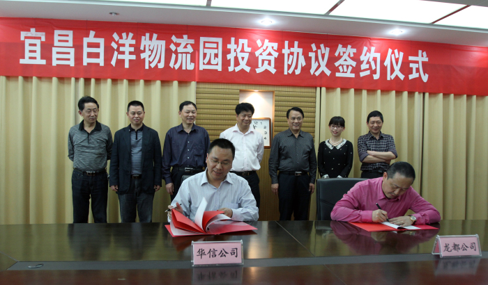 4月18日,宜昌白洋物流园项目投资协议签约仪式在华信交投公司举行。市交通运输局党组书记、局长,华信交投公司党委书记、董事长马宏彦出席签约仪式并讲话。市交通运输局在家的领导胡开德、张德义、胡朝晖、李中华、李德宏及市交通物流局局长杨家训等出席仪式并见证项目签约。华信交投公司党委副书记、副总经理殷俊与湖北龙都投资有限公司董事长冯燕斌代表投资双方在白洋物流园项目投资协议书上签字。这是华信交投公司作为市级投融资平台,创新项目建设方式,实行股权融资及招商引资而取得的又一项重要融资成果。
