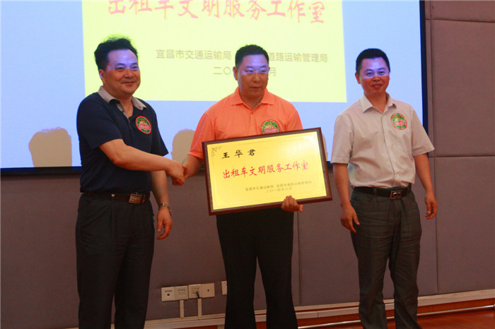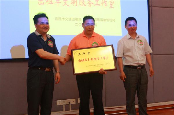 图三:宜昌市首届道德模范、全国五一劳动奖章获得者、宜洋出租车公司总经理王华君向全市的士司机演示推介了“王华君出租车文明服务工作法”