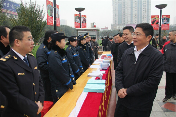 图为:市委副书记、政法委书记王兴於慰问交通法制宣传展台工作人员