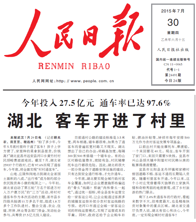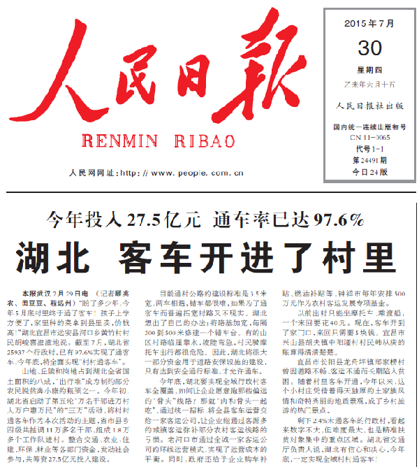 人民日报头版头条报道宜昌市“村村通客车”工作