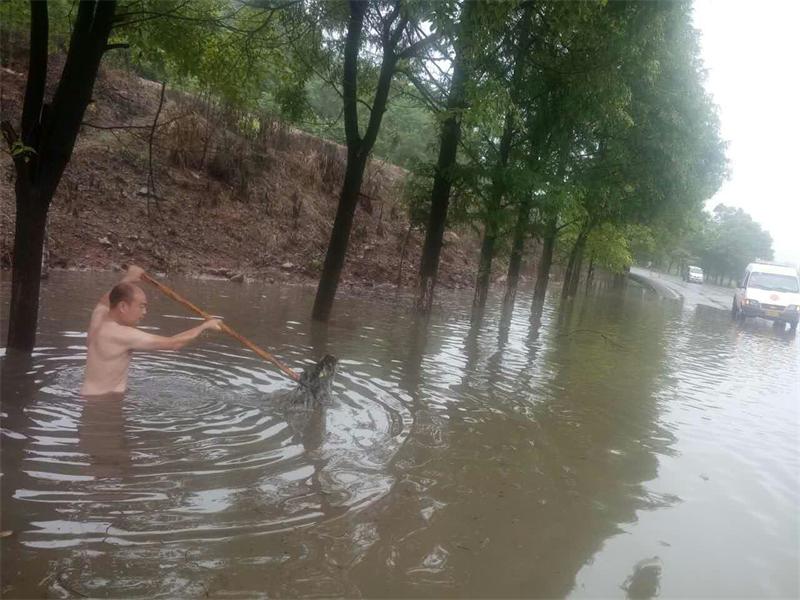 6月25日,宜都持续狂风暴雨,雅澧线K25+800米一处涵洞被浪渣和淤泥堵塞,污浊的泥水聚集成河漫过路面并呈现大面积扩张趋势,行人趟水而过已齐腰深,来往车辆通行严重受阻。接到指令,枝城公路管理站站长张军益火速赶到现场,紧急制定解决方案,决定寻找涵洞口,疏通引流。可派谁去呢?应急小分队成员都自告奋勇,跃跃欲试,站长张军益一挥手:“都听我指令,这水太深,我下去!”话毕,他毫不犹豫的跳下齐腰深的泥水,在浑浊的泥水中仔细摸索涵洞出口。雨还在下,他的脸上被汗水、泥水、雨水冲刷的愈加模糊,时间一分一秒的过去,突然他大喊:“找到了,赶紧把铁锹给我!”大伙儿绷紧的心终于稍稍放松了些,扑通扑通纷纷跳下去,三下五除二涵洞疏通了。雨还在下,看着过往的车辆,他们终于长舒一口气,发出会心的笑容。