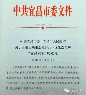 ▲《中共宜昌市委宜昌市人民政府关于开展三峡生态经济合作区生态治理“宜昌试验”的意见》印发。