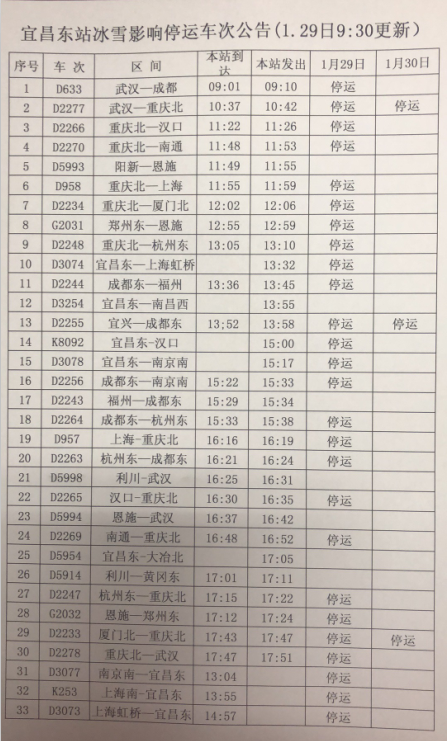 宜昌东站26趟列车停运 道路客运班线将根据道路情况陆续恢复