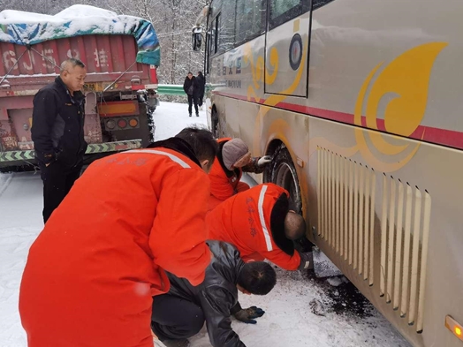 公路应急养护人员在G351五峰马鬃岭路段帮助受困客车安装防滑链,确保群众安全出行。