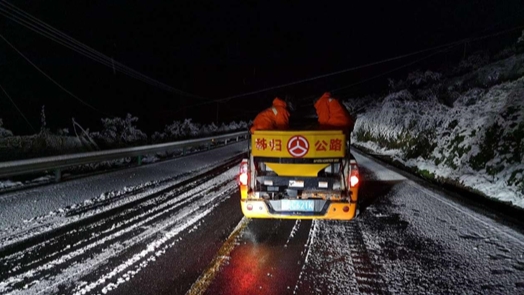 公路应急养护人员上路夜巡,并抛洒融雪剂防止道路结冰。