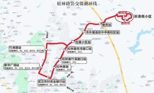 本次开通的松林路公交微循环线,是沿松林路、城东大道、中南路、岳湾路隧道往返运行,线路里程7.9公里,途经市外国语初级中学(中南校区)、市妇幼保健院、中南路商圈、岳湾路小学,填补听涛苑小区公交空白,可有效满足听涛苑小区近千名居民上学通勤、看病就医、购物游玩等出行需求。线路的开通,实现了与B6、B68、91、322等7条公交线路的衔接,让松林路社区及周边沿线居民日常出行更快捷、换乘更方便。
