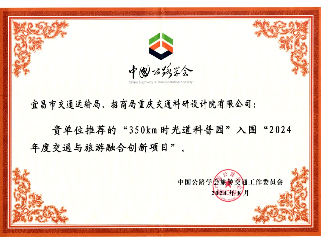 近日,由中国公路学会主办的“第七届旅游交通大会”在新疆乌鲁木齐召开,宜昌市交通运输局负责建设的湖北省首座综合性交通科普基地——“350km·时光道科普园”荣获“2024年度交通与旅游融合创新项目”——“特色专项项目”。