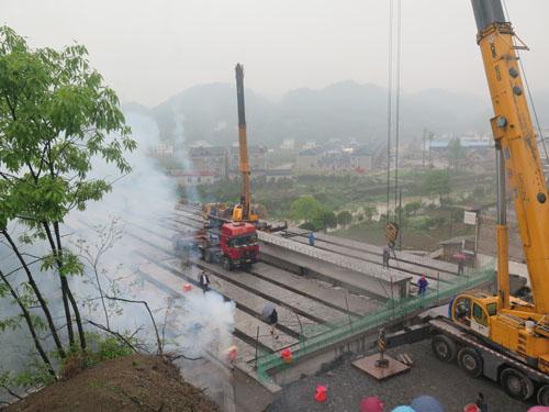 4月5日下午,正值倾盆大雨,但长阳龙五一级公路三标段马磨河大桥的施工现场依然是一片繁忙的景象。随着指挥员的一声哨响,两台200吨的吊车同时起吊,梁板稳稳的落在了桥墩上,龙五一级公路的第三座大桥——马磨河大桥成功合龙。顿时,现场响起一片欢呼声和鞭炮声,周边的老百姓还自发买来鞭炮以庆祝和见证这一重要时刻。