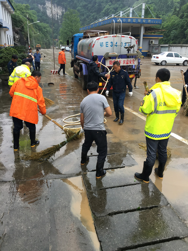 接到灾情后,长阳县公路局高度重视,严格履职尽责,迅速调集救援车辆和人员,准备抢险,由于当晚暴雨持续,318国道多处被水淹没,车辆和人员无法达到。早上6时,公路局组织30名救灾人员、4台应急救援车、2辆洒水车对超限检测站进行了紧急救援。到达现场后,抢险小组迅速组织分工:一组内勤人员登记现场损失财产,损毁票据,并拍摄现场灾情照片;二组人员清理办公室办公设备、厨房淤泥;三组人员清理站外空地树枝石块,并用洒水车冲刷淤泥。中午在检测站食堂简单就餐后所有人员都没有休息,又开始了清理工作。经过10多个小时的奋战,检测站内淤泥终于全部清除,站容站貌基本恢复,但所有办公设备、值班设施、站内停放车辆全部淹没受损,致使超限站工作陷入瘫痪,短期内无法恢复。此次水灾造成直接经济损失约180万元。