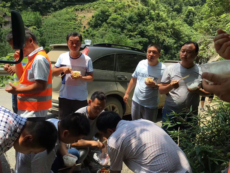五峰交通运输局局长黄家兵、副局长邓阳峰一行在现场吃盒饭(陈艳君 摄)