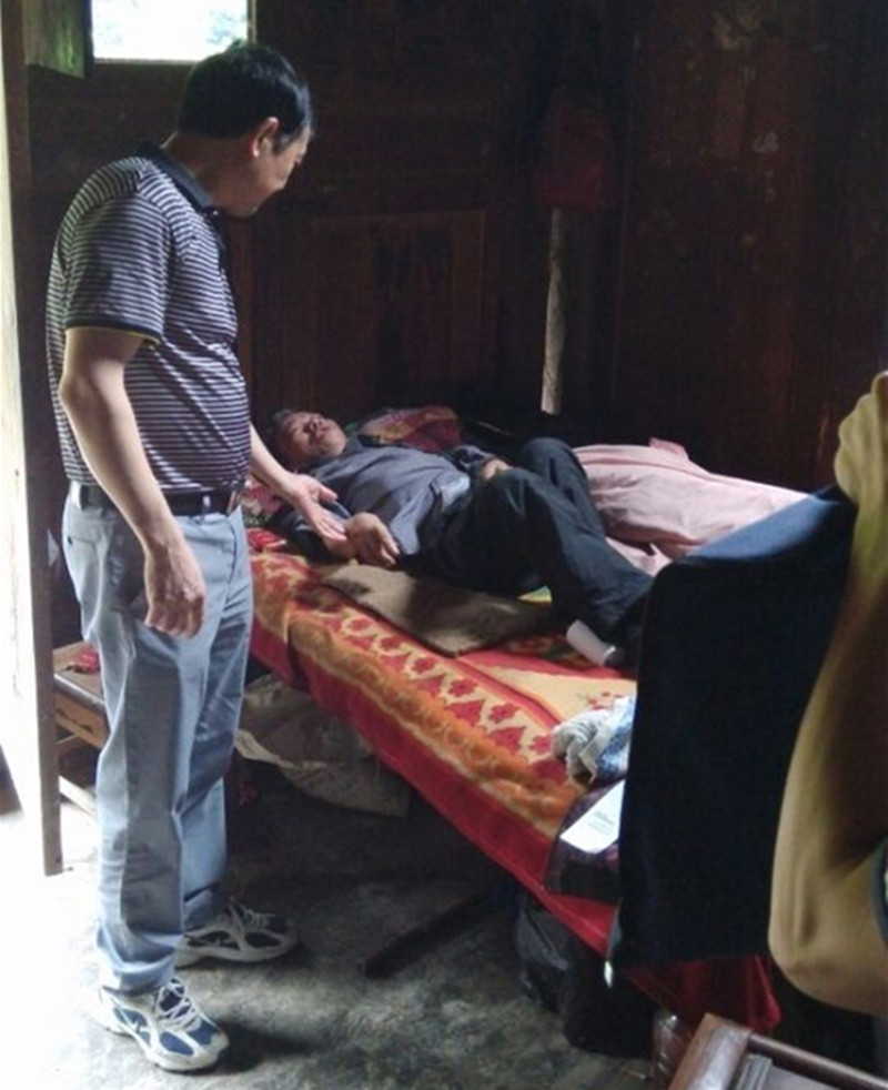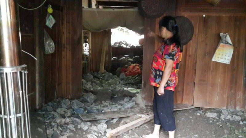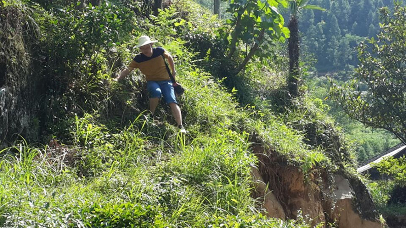 图为交通运输局救灾工作人员翻过山路徒步到农户家中