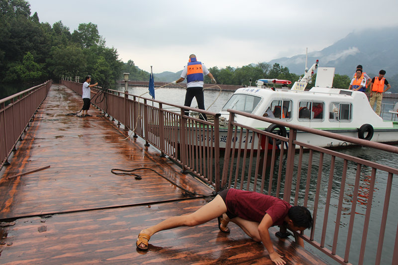 7月30日,长阳县港航海事局组织专班通过对事发水域进行实地查看后了解7月29日导致发生险情的断裂浮桥为清江隔河岩库区北纬30º岛所建用于观光的环岛浮桥。材质为钢质,全长3600米,由于该环岛浮桥长度过长,在自然载荷作用下,风速、风向、水波、流速等因素对该环岛浮桥影响较大,所以在遭受入汛以来六轮强降雨的轮番袭击后,再经7月29日狂风暴雨侵袭,最终导致其断裂脱节。在经实地勘察和总结7月29日险情情况后,海事局制定方案,组建专班,对该安全隐患进行专项整治。整治时间从8月1日到8月4日,历时三天。长阳港航海事局通过对断裂脱节浮桥进行拖离、重新加固、设置隔离带等措施的同时针对该片水域通航密集、来往船只多等特点,又采取现场实施水上交通管制、短消息群发警示信息等方式对过往船只、有船企业、水上从业人员、周边居民进行警示。