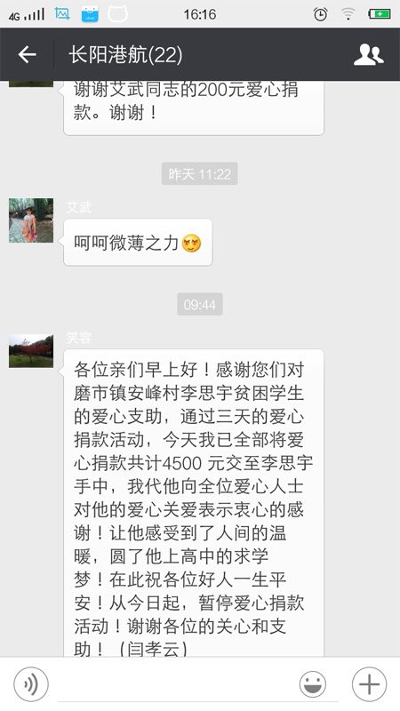 长阳县港航海事局微信工作群在8月21日显示出了这样一条信息:磨市镇马鞍山村三组有一位名叫李孟元(又名李思宇)的学生,其父亲于2015年7月因车祸身亡,家里异常困难,现在学生们的暑假已接近尾声,开学在即,16岁的李孟元同学马上就要读高一了,但除了他一人在家喂养的十几只山羊和几头猪以外,没有其他任何经济来源,所以我想号召各位一起做一件善事,帮他渡过难关,在这里我先感谢大家的关心和支持!发布这段文字的是县港航海事局局长闫孝云,随后他又在微信群里对大家说,希望大家能奉献自己的一点爱心。