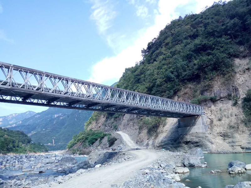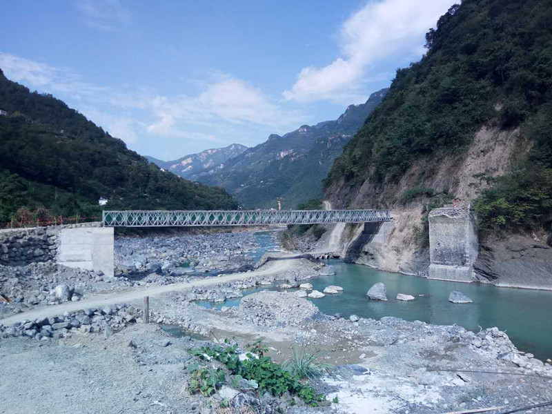今年7月以来,五峰县多次受到特大暴雨袭击,导致五峰西部5个乡镇交通、通信中断,傅家堰乡桥料村唯一出行通道桥蒿公路中的“仙人岩桥”被冲毁,全村3000多人民群众出行困难。省交通运输厅研究决定,援助五峰修建一座装配式钢桥,短期解决桥料村交通出行问题。钢桥构件经过12个小时长途运输,于7月26日运抵五峰。交通、武警、傅家堰乡政府等部门紧密协作,加班加点修建临时便道、新建桥梁两侧桥台。经过1个月的建设,省交通运输厅、公路管理局支援的“爱心桥”——仙人岩装配式钢桥于8月31日架设完成,及时解决了人民群众出行问题。(图片 林建华摄)